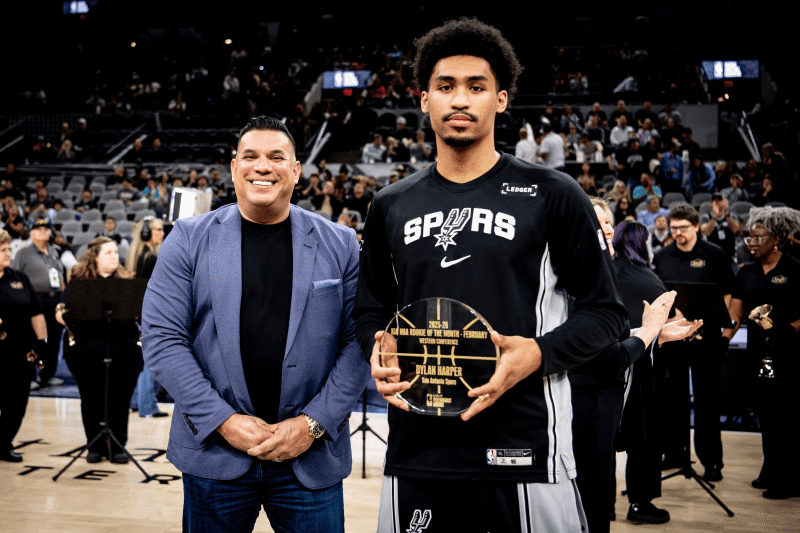 马刺官方晒照:迪伦-哈珀赛前领取2月份最好少壮球员奖杯。